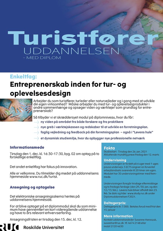 Tre af aktiviteterne på diplomuddannelsen til turistfører indgår i kortlægningen på Roskilde Universitet. (s. 28). Ud over de to valgfri moduler nævnes det obligatoriske modul ob4: Turdesign og bæredygtig turismeudvikling”. Uddannelsen indgår også i tre af strategiske tiltag på universitet: det nu afsluttede tre-årige projekt ”Innovation og udvikling af bæredygtig bynær naturturisme”, det ovennævnte projekt fra Fonden for Entreprenørskab samt aktiviteter i INVIO – Innovationsnetværk for oplevelseserhverv.